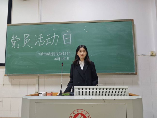 2025年11月2日晚,化学与材料科学学院学生党支部第九十八期“党员学习日”活动于行知楼601开展,2303班张莹同学以《以教育家精神铸魂强师 谱写教育强国建设华章》为题与全体学生党员和学习积极分子分享了她的学习心得。