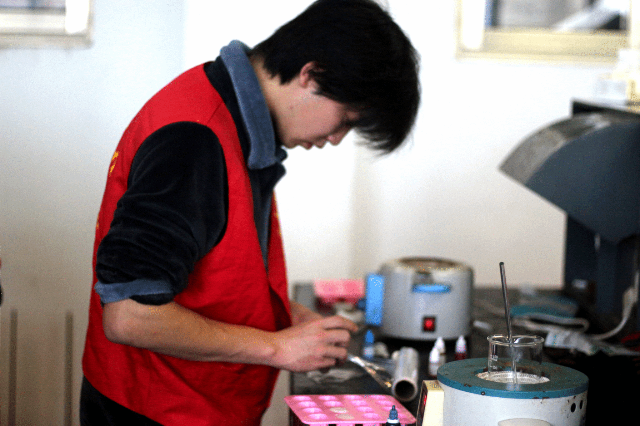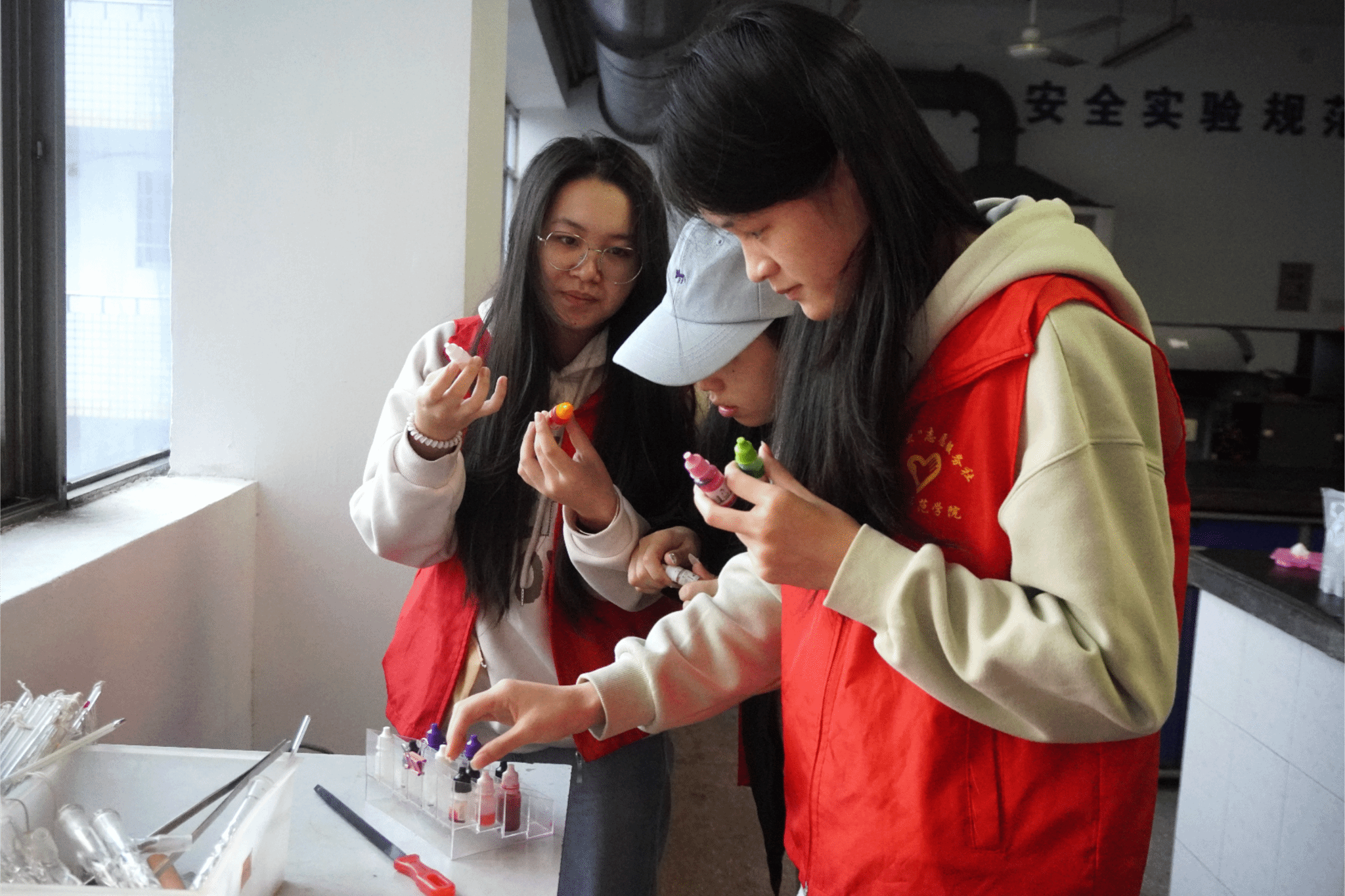 (志愿者们正专心致志地调配原料、搅拌皂液)