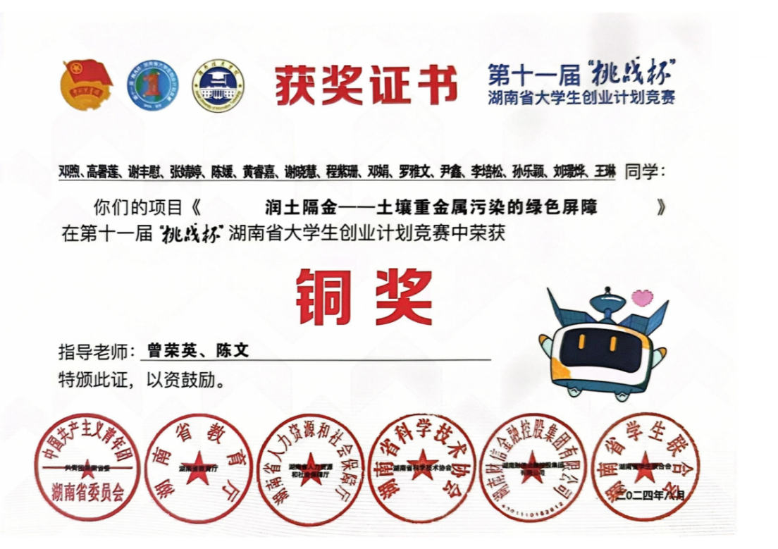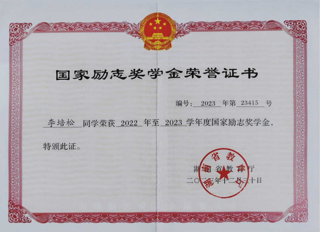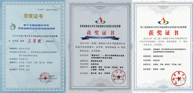 李培松将科创探索作为大学核心主线,入学之初便主动加入实验室,在学习与实践中系统掌握科研方法,并以第二作者身份在SCI二区期刊发表论文。除此之外,作为核心发明人之一,其实用新型专利《一种新型便携式识色机》获国家知识产权局受理。同时,他担当团队重任,负责实验室管理,带领团队斩获第17届大学生节能减排社会实践与科技竞赛国家级三等奖、首届及第二届湖南省大学生节能减排社会实践与科技竞赛省级一等奖等荣誉,累计获十余项国家级、省级奖项与课题项目,在科创钻研、赛场攻关与团队协作中全面奋进。